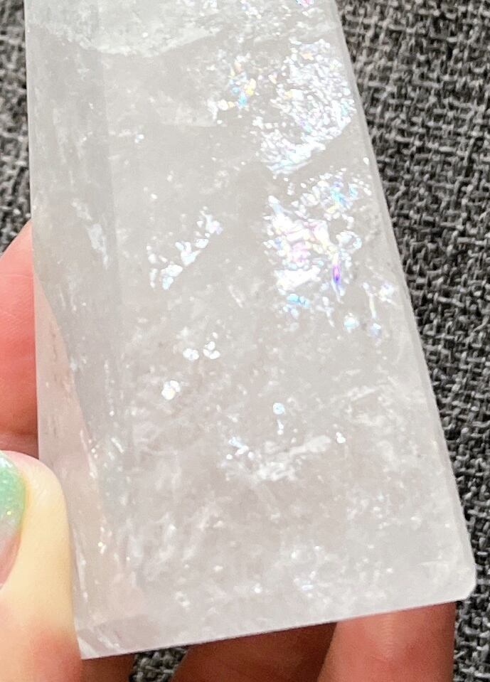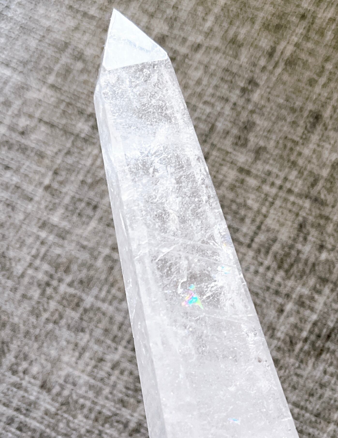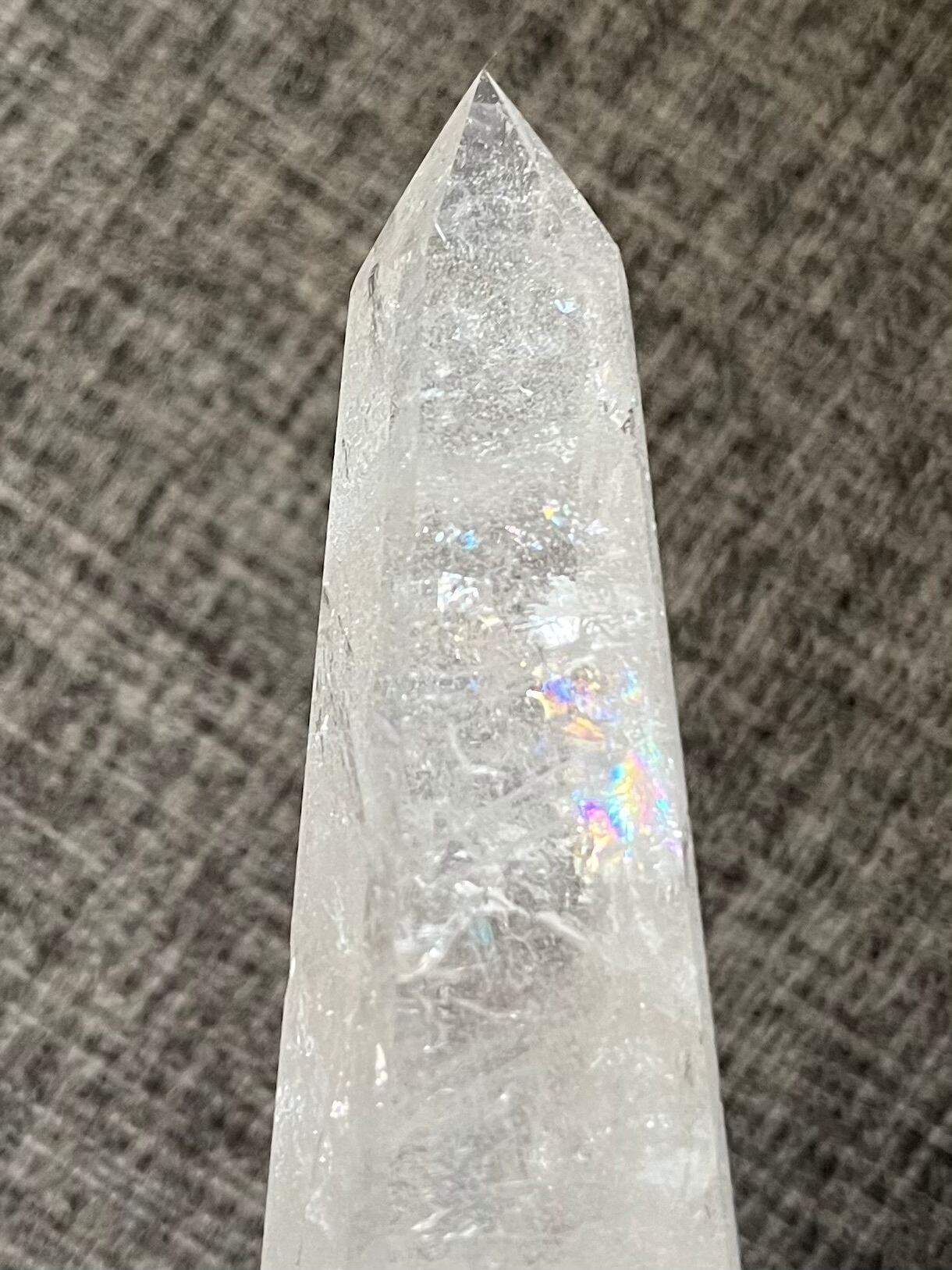 透明感と優しい光を放つオベリスク(尖塔型)に研磨された一点もの。内部のレインボーが美しく輝きます。
