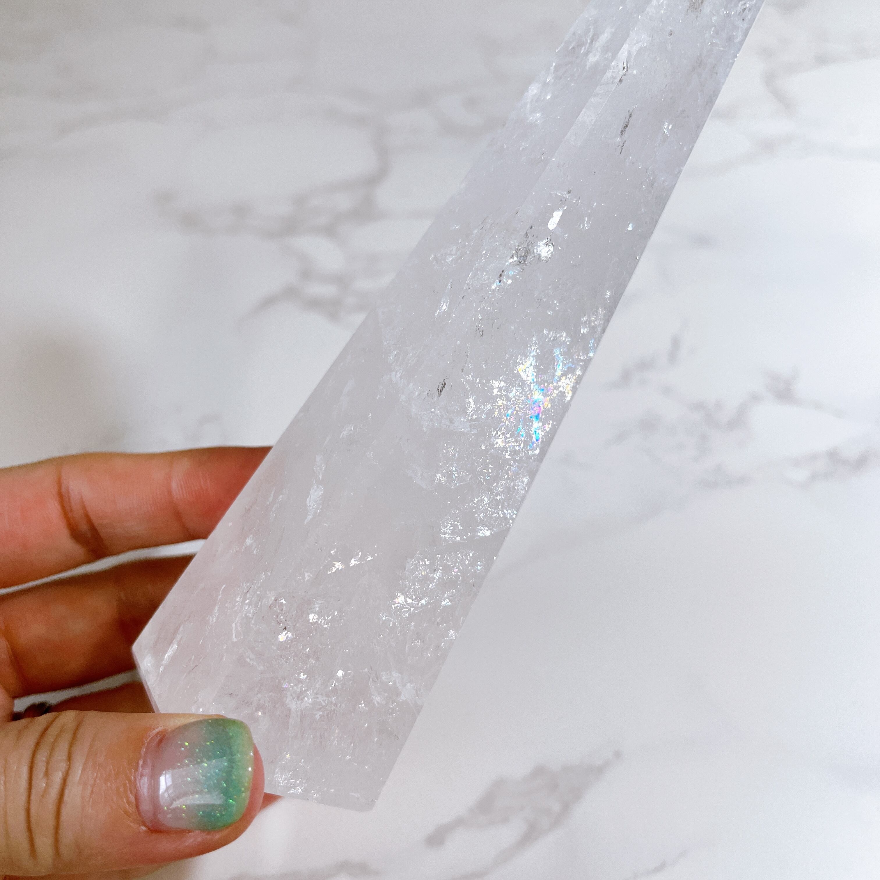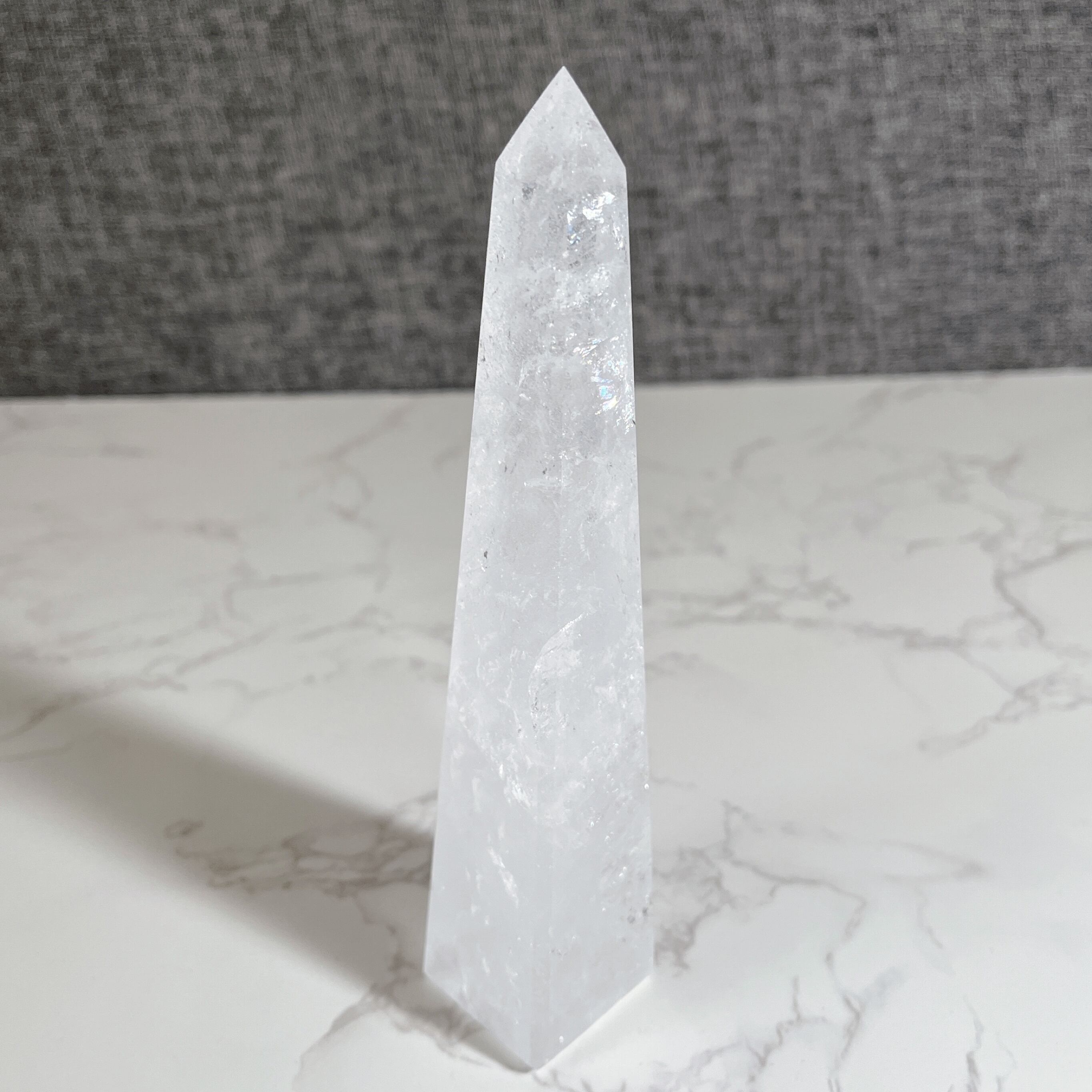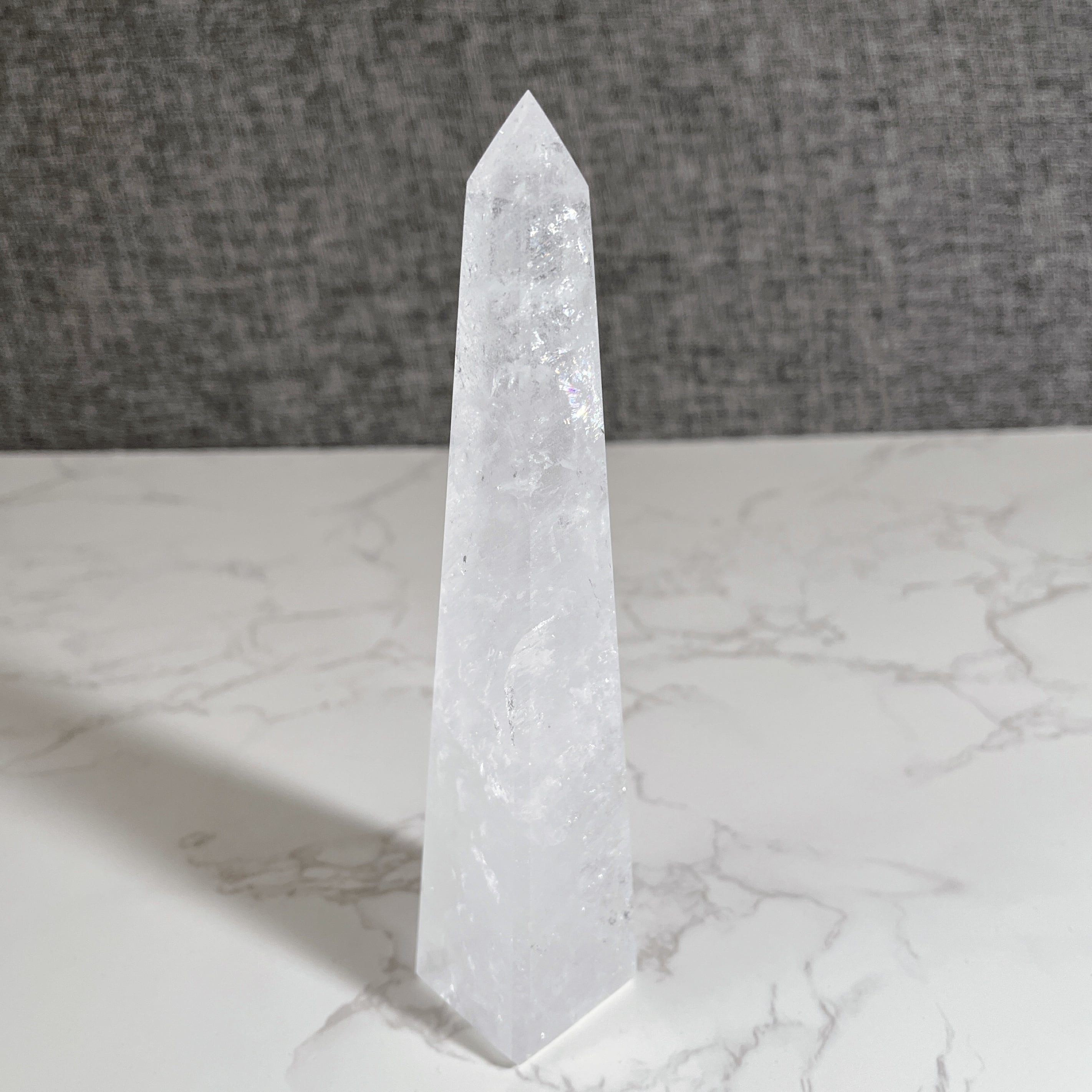 透明感と優しい光を放つオベリスク(尖塔型)に研磨された一点もの。内部のレインボーが美しく輝きます。