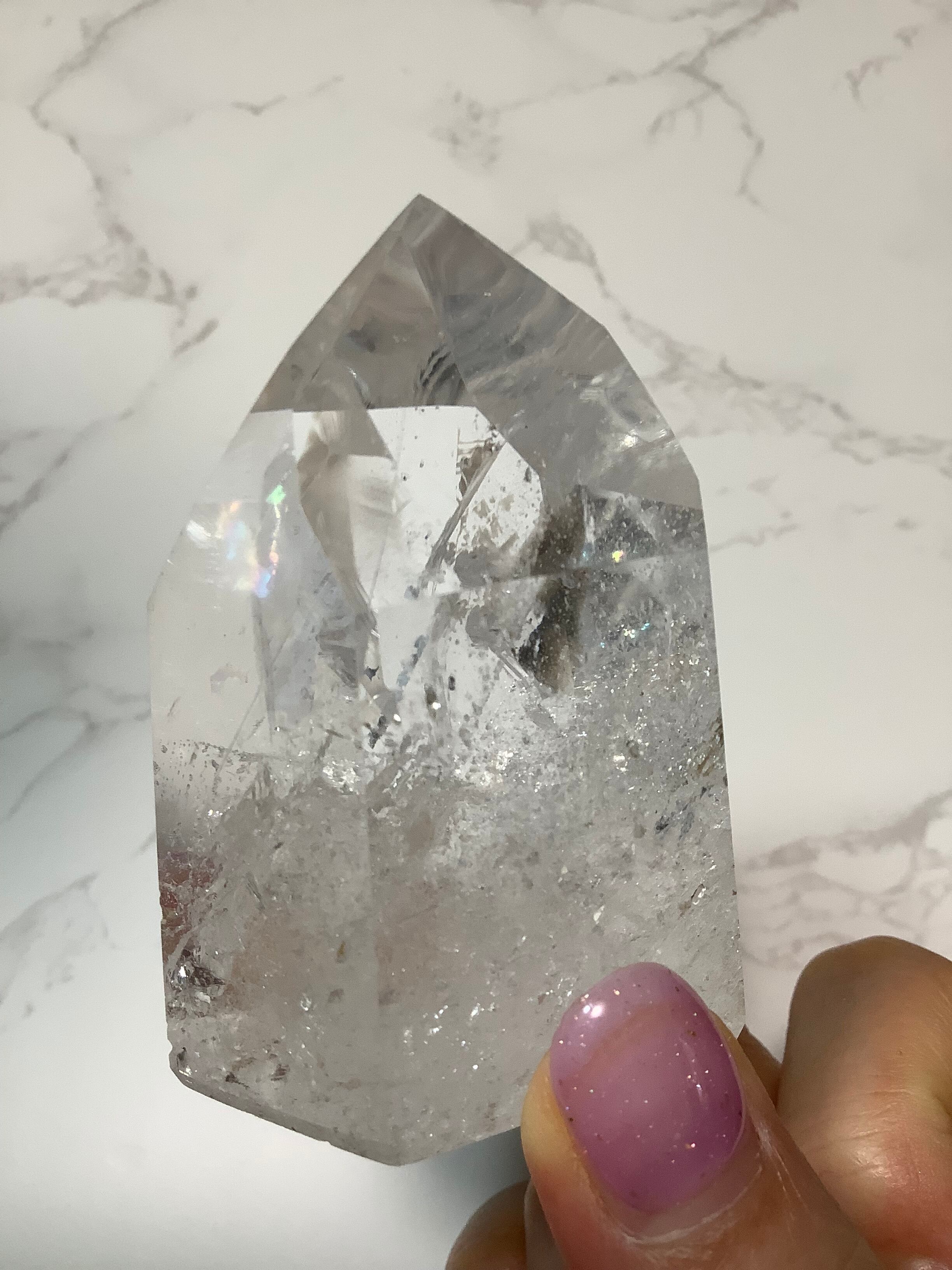 アイリスクォーツとは、水晶が成長過程で起きる亀裂に光が反射し、虹ができるものを言います。