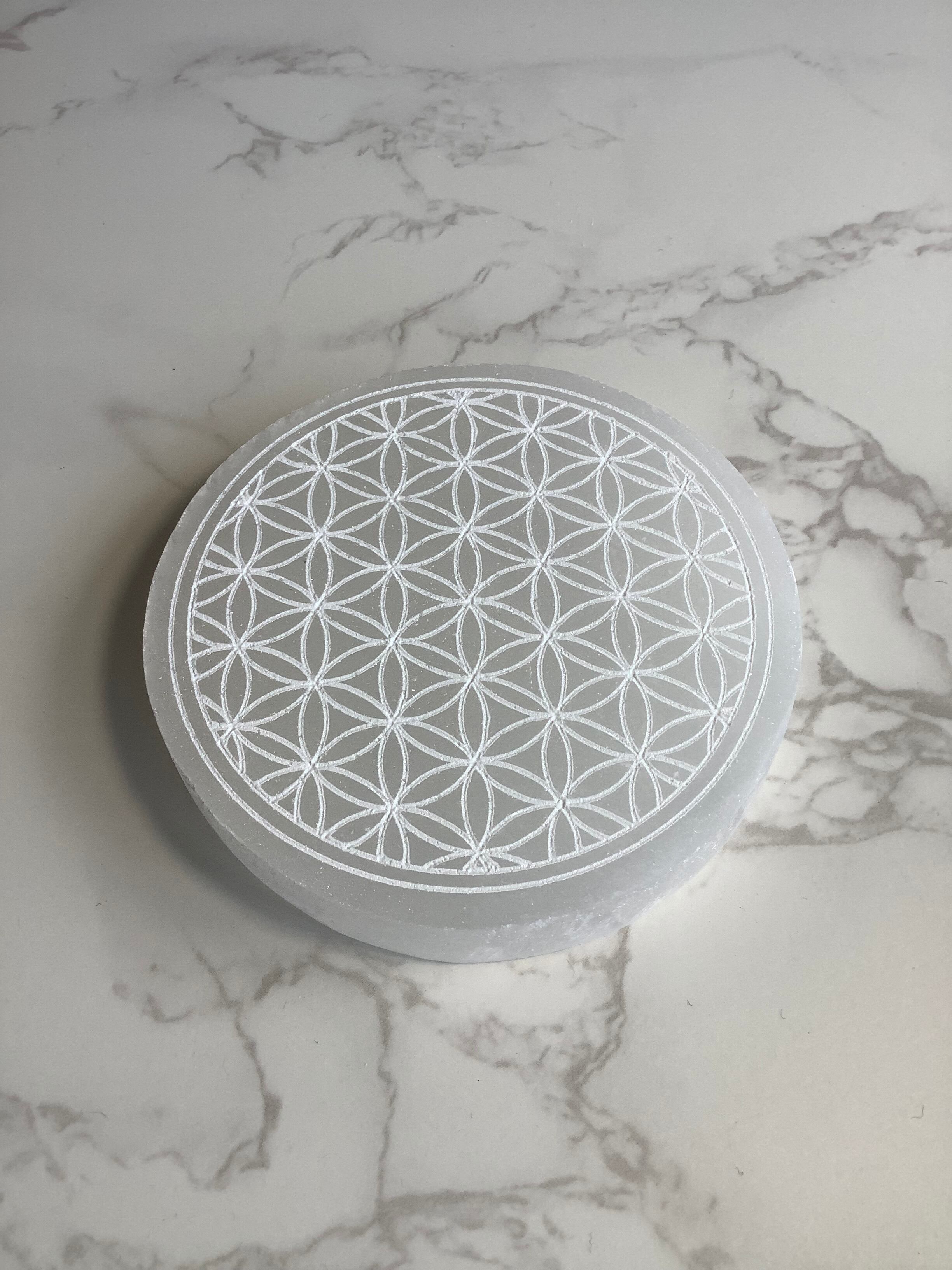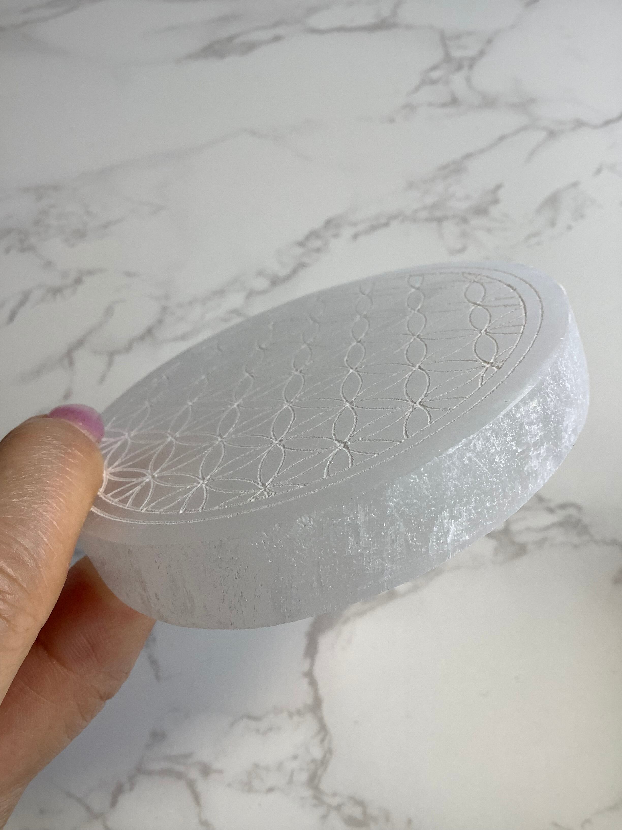 月のように清らかで美しいセレナイトに、フラワーオブライフが施されたプレート。