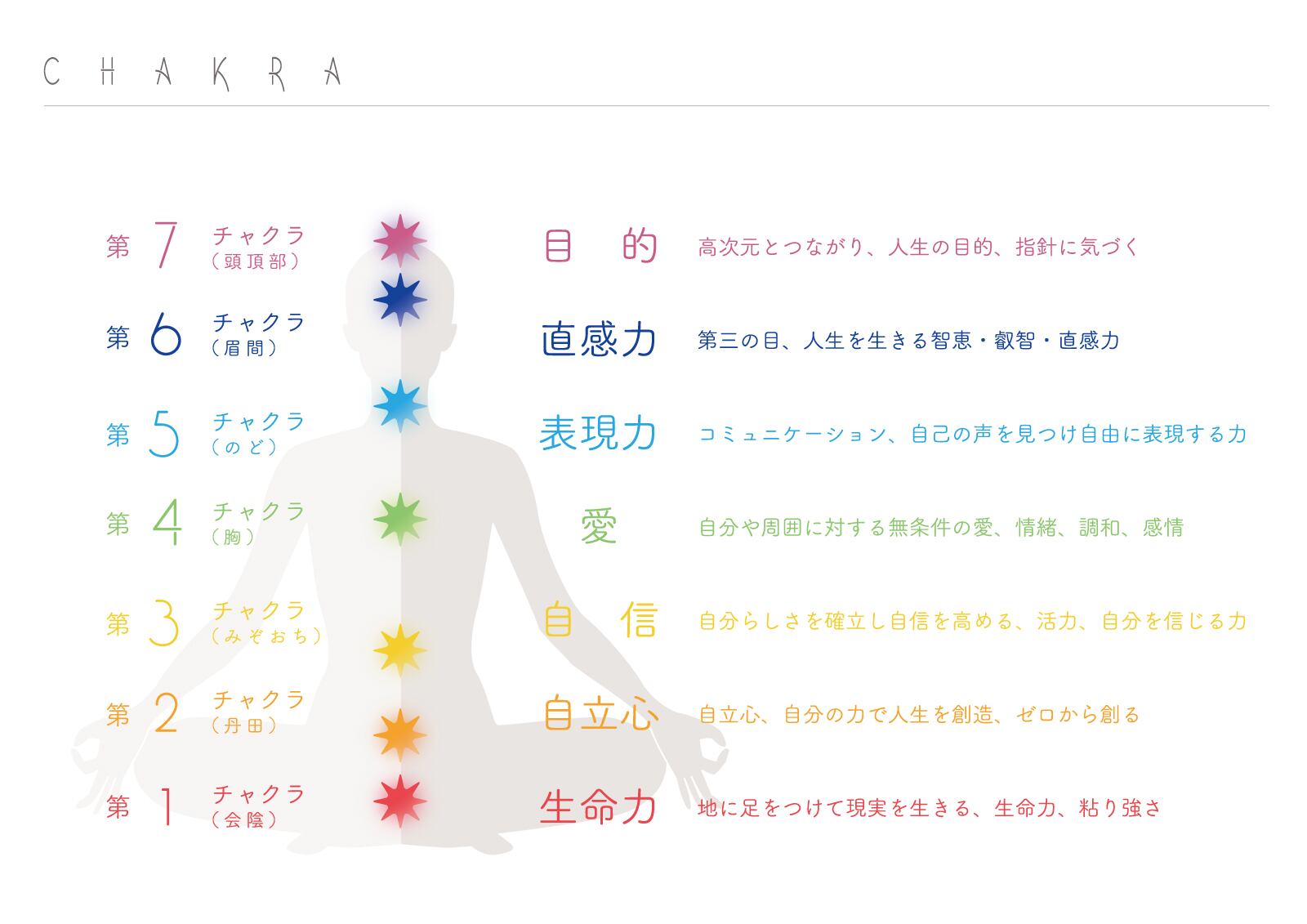 体内に7つの主要なチャクラポイントがあり、それぞれが特定の身体的、精神的、感情的な機能に関連しています。